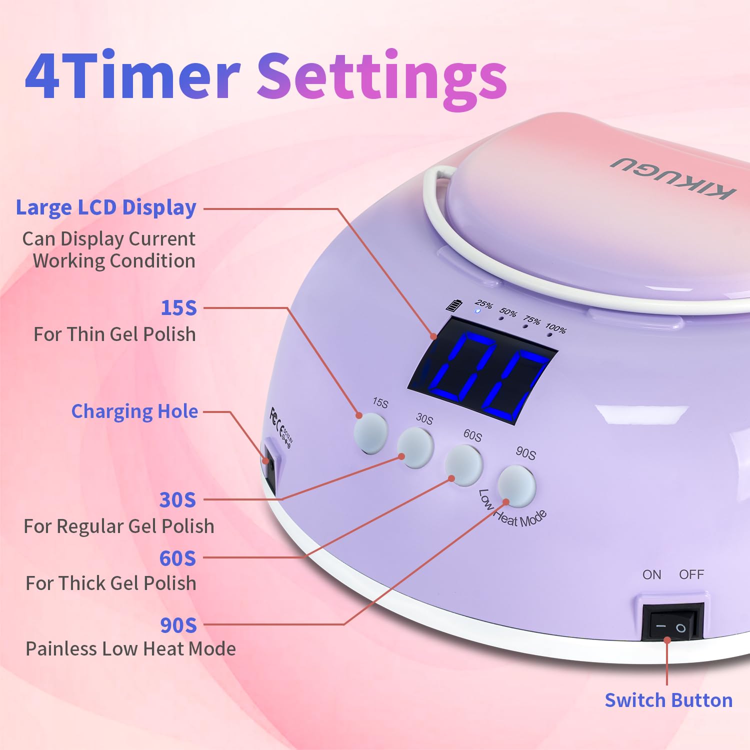- 【4 Timer Settings and Auto Sensor】The UV LED nail lamp design with 4 timer settings, including 15s, 30s, 60s, 90s(Painless Mode),You can choose different curing times according to UV and LED gel nail polish type;Kikugu cordless nail lamp Built-in infrared sensor lights,it will auto start when hands get in and auto shut down when hands out.